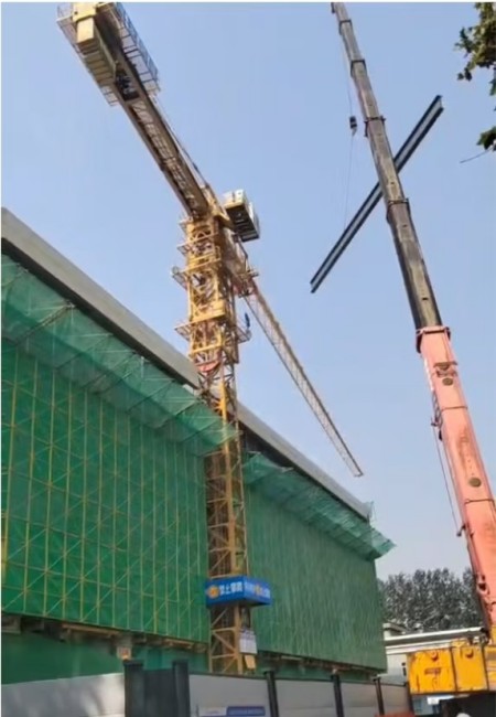 “大臂往右,慢一点……”塔吊下,信号工通过对讲机指挥塔吊缓慢旋转避让。随后,负重吊车精准、平稳地将钢梁吊装到施工区。