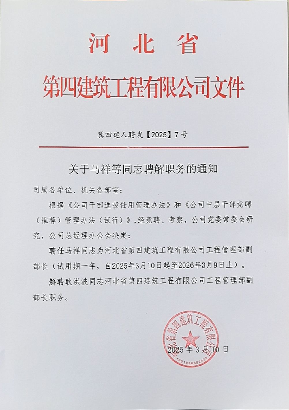 河北四建:关于常健宇等同志聘解职务的通知